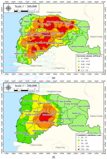 where denotes the electricity consumption of managed wells per unit area and E denotes the total electricity consumption of managed wells by division unit. Figure 2d,e illustrate the distribution of the managed wells and the electricity consumption of the managed wells of Yunlin County. According to Figure 2e, it is clear that the electricity consumption of the managed wells at the middle of Yunlin County is higher than that of the eastern and western Yunlin County.
