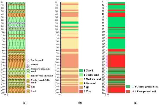 Based on the unified soil classification system, coarse-grained soils are gravelly and sandy in nature with less than 50% passing through the No. 200 sieve [29]. As listed in Table 2, two groups, the coarse-grained soils and the fine-grained soils, were classified from the WRA [26]. The coarse-grained soils contain three types of soils, namely gravel, coarse sand, and medium sand. The percentage of coarse-grained soil is the ratio of the thickness of gravel, coarse sand, and medium sand to the total drilling depth.