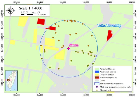 This study calculated the proportion of the agricultural land use within 250 m of each multi-layer compaction monitoring well (MLCW), as shown in Figure 4. The buffer analysis tool in ArcGIS creates buffer polygons around input features to a specified distance to adopt the spatial analysis and calculates the proportion of the agricultural land of the specified area. The percentage of agricultural land use is defined as follows.