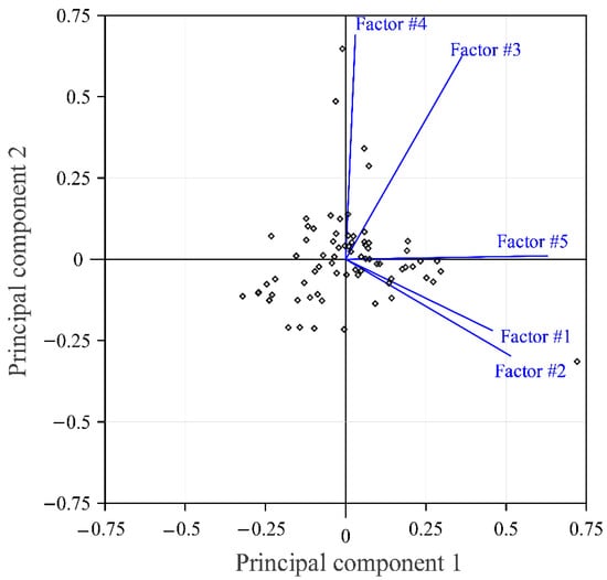 According to the loading of the first two principal components in Table 6, the distribution of principal components can then be analyzed. Figure 5 displays the distribution of the principal component. As shown in Figure 5, all factors utilized are positive on principal component 1. Among them, factor #1 (percentage of agricultural land use), factor #2 (electricity consumption of wells), and factor #5 (accumulation depth of land subsidence from 2015 to 2020) have higher loading in the first principal component. It appears that the first principal component is mainly based on the proportion of agricultural land use, electricity consumption of wells, and accumulated subsidence data, while other factors also show a positive correlation with the accumulated land subsidence. According to Figure 5, factor #3 (percentage of fine-grained soil) and factor #4 (length of average maximum drainage path) have a higher loading in the second principal component. It was found that the second principal component is more correlated with the length of average maximum drainage path in terms of fine aggregate content, which can also be obtained from Figure 5. The results obtained illustrate that the electricity consumption of the wells and the loading of the accumulated land subsidence on the first principal component are very similar, indicating that these two factors are highly correlated. The results of this example demonstrate that the electricity consumption of wells is highly correlated with the accumulated land subsidence. In addition, the first principal component can be explained as an acquired factor causing land subsidence, such as the excessive withdrawal of groundwater. In addition, the second principal component can be interpreted as the congenital factor causing land subsidence, that is, the data related to the characteristics of the soil layer. Since the electricity consumption of wells has the highest correlation with the accumulated subsidence, factor #5 (accumulation depth of land subsidence from 2015 to 2020) is closer to the first principal component in the distribution of the principal components, as shown in Figure 5.