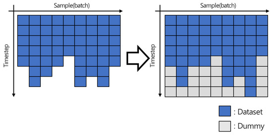 Time series data have a multidimensional tensor shape that changes with time and are analyzed using specialized methods, including RNN. The preprocessing required for the RNN method involves transforming the data into a specified tensor form. Most RNN methods accept data as three-dimensional tensors of batch size, timestep, and feature dimension. In other words, all data in one mini batch must contain the same number of timesteps on the time axis and the same dimension. However, testbeds in most fields include different timesteps. For instance, in the field of natural language processing, the word count varies in different sentences. This discrepancy is compensated using several methods. Padding is one such method, wherein a dummy is attached to the dataset to fit the longest step length. Figure 2 illustrates a conceptual diagram of zero-padding. The padding method fills the amount corresponding to the insufficient step using a dummy. This method requires additional work because the dataset must be transformed during the padding process.