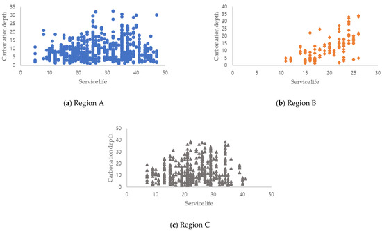 The natural carbonation data were collected from bridge inspection reports of three regions in Korea. Typically, bridge managers conduct periodic inspections and report the test results. In this study, 242 inspection reports of RCS structures were collected from three regions. Table 1 lists the reports collected from each region. Region A was a relatively densely populated downtown area, Region B was a low-density coastal area, and Region C was an island.