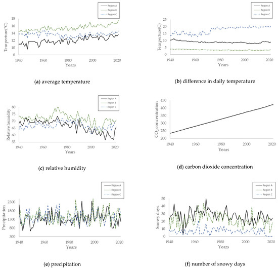 History of environmental conditions according to regions: (a) average temperature; (b) difference in daily temperature; (c) relative humidity; (d) carbon dioxide concentration; (e) precipitation; and (f) number of snowy days.