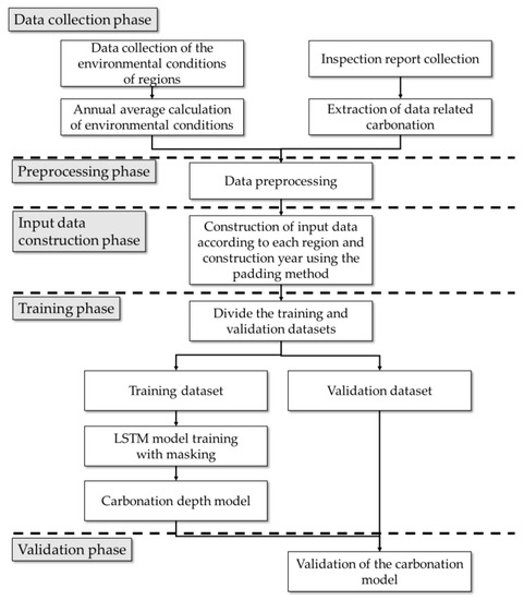 In the learning phase, the training and validation datasets were generated by dividing the dataset. The LSTM model was trained as a carbonation model for the training dataset. The padded dummy timesteps used a masking method to ensure that the training weight was zero. This method reduced the training time by excluding dummy data and improved the reliability of the model. Finally, the trained model verified the LSTM-based carbonation model in the validation phase using the validation dataset.