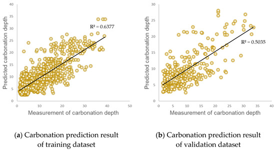 The carbonation estimation model was trained using the input data. The model was then verified by maintaining the training and validation data ratio as 80:20. We used the random extraction method and the Adam learning method; the number of iterations was set to 100. The coefficient of determination and RMSE were selected as the performance indicators of the carbonation model. Typically, the coefficient of determination denotes the proportion of variance of the response variable, which can be explained by the applied model. In general, a coefficient of determination greater than 0.5 implies that the predictor variable can statistically predict the response variables. Table 5 and Figure 8 present the training and validation results. The learning time was 556.20 s. The hardware specifications were Intel i7-7700K CPU 4.20GHz and NVIDIA GeForce GTX 960. The coefficient of determination of the training data and the RMSE were 0.638 and 4.572, respectively. Conversely, the coefficient of determination of the verification data was 0.504, and the RMSE was 5.057. Thus, the coefficients of determination for both the training and validation datasets exceeded 0.5.
