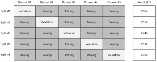 The cross-validation was conducted to check for overfitting of the proposed model. Cross-validation verifies whether a particular dataset is overfitted when the dataset has a small size. The k-fold method was used for cross-validation. The k-fold cross-validation divided the training dataset into four folds, and a total of five folds were included in the validation dataset. The distribution method was randomly selected. Figure 9 shows the results of the cross-validation. The average of the cross-validation result was 0.5028, which was slightly different from the first experimental result. This result verified that the experimental results were not overfitting for a specific dataset.