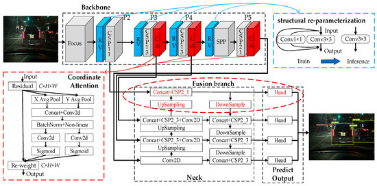 Although the original YOLOX model achieves better performance than other methods for the detection task in this paper, there are still large missed and false detections for small targets, occlusions, and low-illumination environments at night. Therefore, the model structure and loss function of the algorithm are improved in this paper to improve the detection accuracy of nighttime vehicle/pedestrian targets. One of the schematic diagrams of the improved model structure is shown in Figure 1.