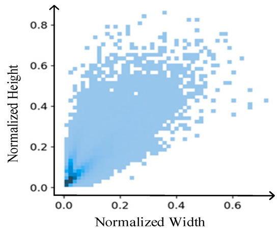 The label-scale information of the nighttime vehicle/pedestrian dataset was scattered and visualized as shown in Figure 2. Among them, the width and height of the target size after normalization are mainly concentrated in the position less than 0.07, i.e., the width of the detected targets is mostly less than 89.6 (1280 × 0.07) and the height is mostly less than 50.4 (720 × 0.07). It is obvious that most of the detected targets are comparatively small. Therefore, it is necessary to ensure the detection accuracy of the algorithm for small, dense targets.