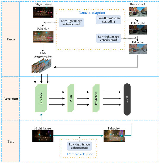 However, due to the large variability of color features between daytime and nighttime data, which are distributed in different data domains, the model easily deviates from the target data domain if the mixing training is performed directly without domain transfer, and the obtained performance improvement is not significant. To reduce the color feature differences between the two data domains, a data domain transfer approach was used to process the nighttime and daytime datasets separately: First, the raw nighttime and daytime vehicle–pedestrian datasets are low-illumination enhanced and low-illumination degraded to generate fake-day and fake-night vehicle–pedestrian datasets. Then, the fake-night vehicle–pedestrian dataset was separately low-illumination enhanced to also generate the fake-day vehicle pedestrian dataset. Finally, the two generated fake days were mixed and trained for the purpose of data expansion. It is worth noting that since the data domain in the training phase was transformed, the test phase required low-illumination enhancement of the dataset to shrink the differences in color features between the training and test sets. The whole training and testing process of the detection algorithm is shown in Figure 3.