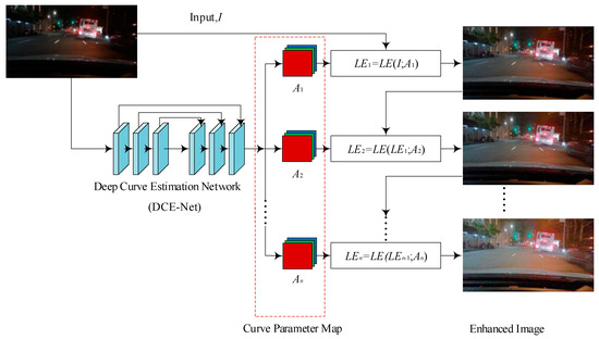 In order to enhance the color features of vehicle and pedestrian targets at night, this paper uses the Zero-Reference Deep Curve Estimation (Zero-DCE) algorithm to achieve low-light enhancement. The algorithm processing process is shown in Figure 4.