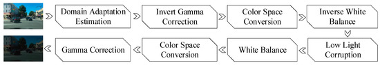 Further, this chapter was redesigned for the low-illumination degrading stage proposed by Cui et al. [69] to allow the daytime dataset to generate images closer to the target domain. The entire low-illumination degrading transformation is shown in Figure 5, with a new domain adaptation estimation module, and the inverse tone mapping and quantization modules were removed compared to the original paper. Experimentally, these two modules produce the generated results, which makes it difficult for the model to explore the target features and is not conducive to training.