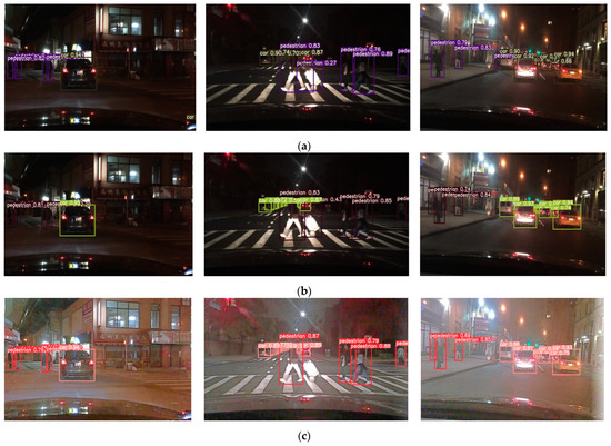Comparison of detection results under the night scenario. (a) YOLOX; (b) improved YOLOX (ours); (c) improved YOLOX + Domain Transfer (ours).