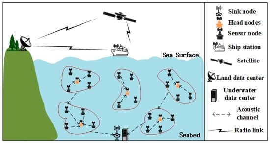 The network architecture of the proposed SROA is shown in Figure 1. Sensor nodes are randomly deployed underwater and divided into a number of clusters. Each cluster elects the cluster head and potential cluster head for data transmission between clusters. In order to transmit the sensed data through acoustic channels, sink nodes are deployed on the seabed that are integrated with the underwater data center, making it convenient for aggregating or processing sensed data, then forward the sensed data to the terrestrial base station for further data analysis. The deployed sensor nodes collect data from the surrounding environment and the sensed data will be sent to the sink node through multi-hop forwarding. In a three-dimensional system, the distance between the two sensor nodes [9] is calculated as follows,