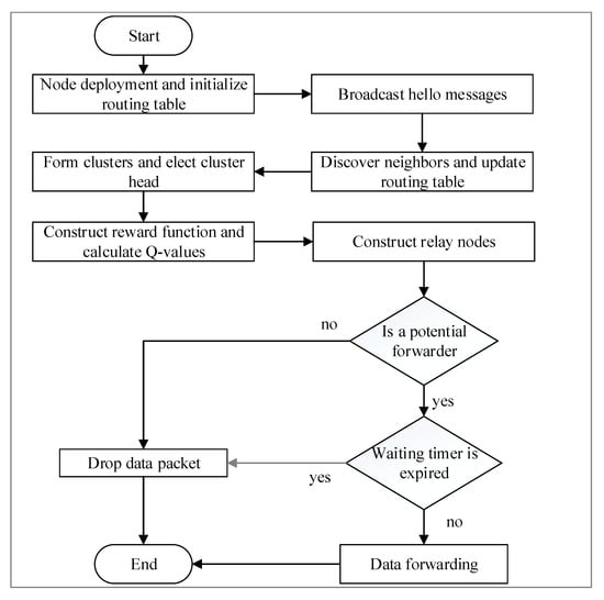 Once an ordinary node receives the data packet, it updates the local neighbor table through the received packet header and then forwards the data packet to its CH or PCH. If the data packet is received by a CH or PCH, it retrieves the packet header and neighbor table for the information updates. If it is in the relay set, the candidate set will be constructed by the calculated the Q-values of the Q-Learning, based on related factors and the packet header is wrapped with the relevant fields. A waiting timer then starts. Otherwise, the current node is not in the relay set and the reception will be dropped.