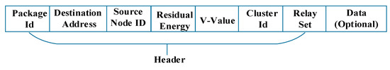 Figure 3 shows the data packet structure of SROA. The packet format is used to convey information across nodes and to coordinate the clustering and routing processes. There are two parts in SROA: The header and the data. The header contains packet-related fields and routing-related fields. The first two fields denote the source and destination address. Other header fields are the routing decision-related fields, including source node ID, residual energy, V value, cluster ID, and relay set.
