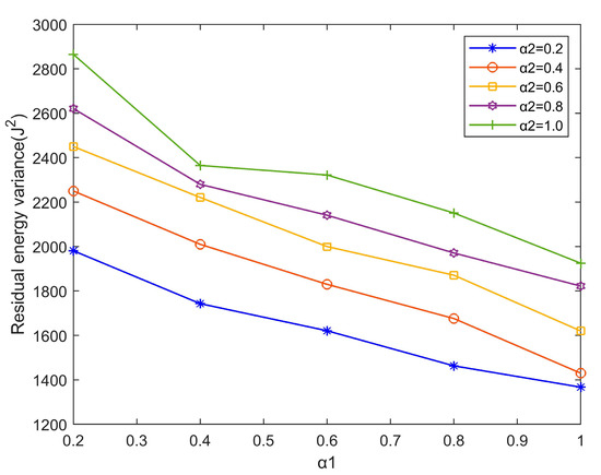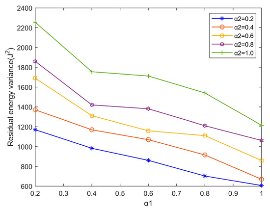 The simulation experiments of different coefficients are conducted in the network with 300 nodes under different communication ranges of 1000 m and 1500 m. We evaluate the performance metrics of residual energy variance and average end-to-end delay in the network. The effect of α1 (total cost weight) and α2 (delay and link quality weight) on the residual energy variance with two different CRs are shown in Figure 4 and Figure 5, respectively. The reward function is influenced by the coefficients, with α1 varying between 0.2 and 1.0 and α2 varying between 0.2 and 1.