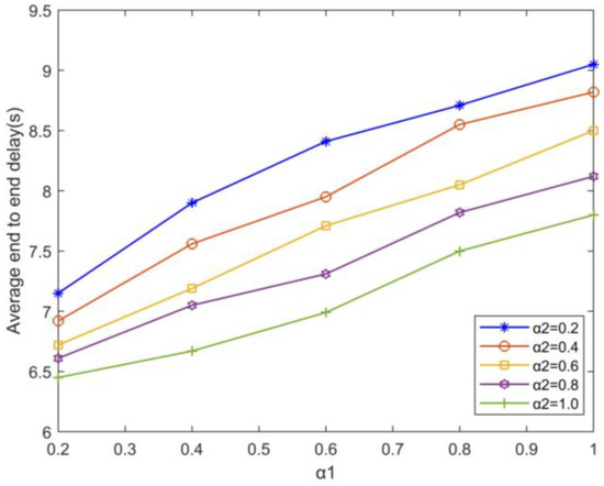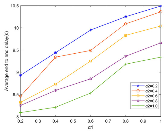 Average end-to-end delay of α1 and α2 (CR = 1000 m).