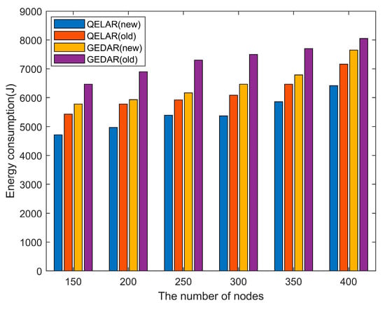 We can observe from Figure 8 that QELAR and GEDAR with the on-site architecture consumes less energy than the original architecture, which reduces the total energy consumption by 25%. One of the reasons is that the data center deployed near the data source shortens the transmission distance thus reducing energy consumption. Besides, with the same architecture, the energy consumption of the QL-based QELAR protocol is lower. Due to its constant cost, it tends to choose the shortest path to forward data packets. In addition, it can also be seen that the Q-Learning-based QELAR protocol consumes less energy with the same architecture, because it usually chooses the more optimal path to forward data packets in a global view.