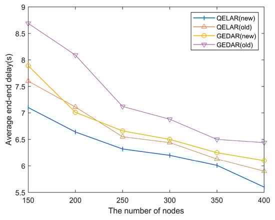 The average end-to-end delay of the protocols with different architectures is shown in Figure 9. Corresponding to Figure 8, the end-to-end delay with the on-site architecture is significantly reduced. The reason is similar to Figure 8, with the on-site architecture, data packets are forwarded with fewer hops and there are fewer nodes participating in the route, thereby reducing the average end-to-end delay.