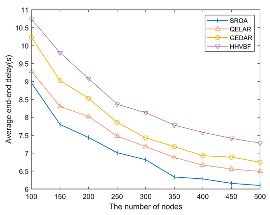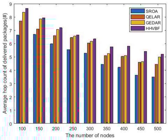 In UASNs, it is expensive to increase the number of nodes and this makes a new deployment. Therefore, the scalability of network is very important. Considering the above experiments, the performance metric of network scalability can also be observed. Figure 8, Figure 9, Figure 10, Figure 11, Figure 12 and Figure 13 demonstrate the comparison between SROA, QELAR, GEDAR and HHVBF in terms of average end-to-end delay, PDR, energy consumption, and average hop count with different scales of nodes varying from 100 to 500. The simulation results show that the performance metrics of the proposed SROA are excellent among the four protocols and remain stable irrespective of the increasing network size. By adding new nodes in the network, the four evaluation indexes are improved.