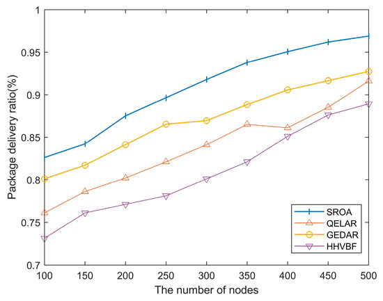 Figure 11 compares the packet delivery rate of SROA to that of QELAR, HHVBF, and GEDAR. It can be observed that the PDR of all four protocols rises as the network size increases. Since relay nodes have more available neighboring nodes for relaying data packets, the packet delivery rate improves. We can also see that SROA has a greater PDR than the other methods. For example, SROA’s PDR reaches 96.6% when the network size is 500, which is greater than that of GEDAR, QELAR, and HHVBF. One of the reasons is that the reward function of the SROA protocol considers not only link quality while determining routing decisions, but also related factors such as residual energy and end-to-end latency, ensuring high PDR globally. However, grouping the sensor nodes into several clusters and the replication mechanism of cluster head makes the transmission more reliable. Moreover, based on the on-site architecture, the data packet travels fewer hops to the sink node, improving the packet delivery ratio. For the QELAR, since the sender may choose a path with fewer hops to improve the packet delivery rate, the PDR of it increases. As GEDAR considers the expected packet advance, more than one node participates in the packet forwarding. Therefore, in the figure, GEDAR’s PDR is substantially larger. The PDR of HHVBF is the lowest, as it does not take the packet error rate into account, resulting in unnecessary retransmissions and low PDR.