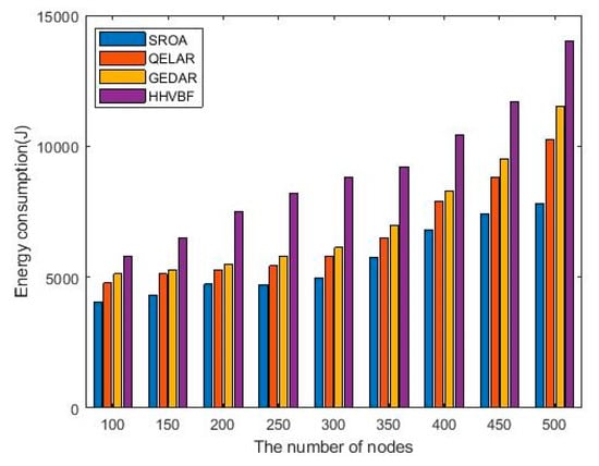 Energy is very precious and important in the underwater environment; each routing protocol should consider the efficiency of energy consumption seriously. The comparison of energy consumption with a network size ranging from 100 to 500 is shown in Figure 12. From the figure, we can find that the total energy consumption of these protocols increases as the network size grows. Generally, it also can be seen clearly that the energy consumed by the SROA is less than other protocols. Specifically, when network size is 500, the SROA consumes 23.8%, 32.1%, and 44.2% less energy than QELAR, GEDAR, and HHVBF. Since the SROA is a cluster-based protocol, the energy distribution of nodes in each cluster is more uniform which extends the network lifetime. Moreover, the SROA uses waiting mechanism based on opportunistic routing to forward packets which reduces the retransmissions, thus SROA consumes less energy in comparison with QELAR and GEDAR. Besides, among the four protocols, the energy consumption of HHVBF is the maximum and grows faster with the increase of nodes. The HHVBF consumes more energy, because neighbors of the source build their own routing pipes and more nodes participating in data forwarding, which results in significant energy consumption.