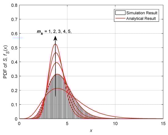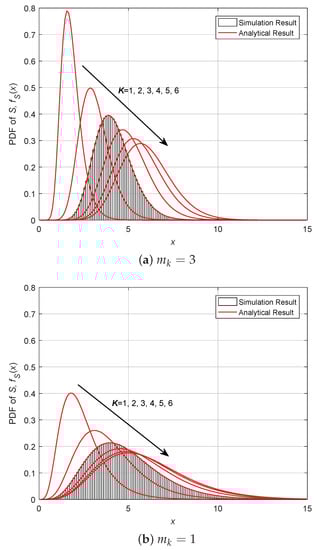 All the previous results dealt with closed-form statistical results only for the Rayleigh distribution case. However, in this study, the Gamma distribution is considered, which is mathematically challenging. Note that the Gamma distribution is related to the Nakagami-m distribution in that both are viewed as a generalization of the Chi-squared distribution. Specifically, the Nakagami-m distribution exhibits a central Chi-squared distribution with degrees of freedom []. This distribution is classically known as a versatile fading model because it is appropriate for modeling multipath fading in urban [] and indoor [] environments with a wide range of fading severity via the fading parameter, m, including the Rayleigh and Rice distributions. Owing to the significance of the performance analysis of the Nakagami-m (or Gamma) distribution, considerable research in this regard is still actively underway [,,,,,].