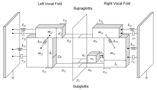 where ζ1, ζ2 refer to damping ratios for the viscous resistances r1a and r2a. Based on previous studies [], we selected the following parameters for the vocal fold polyp: m3r = m1rl3D3/lD0d1, k3r = 0.014, c3r = 3k3r, r3r = r1r(m3rk3r/m1rk1r)0.5, l3 = l0/3, D3 = 0.1D0, d3 = (d1 + d2)/3.