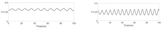 The glottal volume flow velocity U of the normal and pathological vocal folds is shown in Figure 2. As can be seen from the figure, the mass block displacement in both normal and pathological vocal fold models vibrates periodically and produces a valley-cut sinusoidal shape for airflow. However, the amplitude of volume flow velocity U decreases when the polyp is present. In the closing phase of the whole cycle, the pathological vocal fold can not close entirely, and the duration of the closed phase is reduced. As we can see, vocal fold polyps have an impact on the quality and intensity of phonation. Hence, the study focused on simulating muscle activations that may reduce the adverse effect of polyps on phonation.