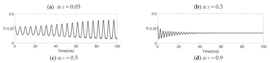 Glottal volume flow velocity U for a unilateral polyp vocal fold model across differing levels of cricothyroid muscle activity, aCT. In each case, aTA was fixed at 0.25 and aLC was fixed at 0.5.