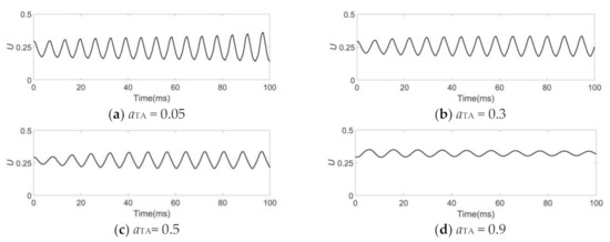 Glottal volume flow velocity U for a unilateral polyp vocal fold model with different aTA. In each case, aCT was fixed at 0.25 and aLC was fixed at 0.5.