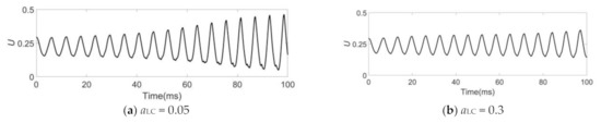 The default parameters in the deterministic vocal fold models with steady airflow used in Table 1 are considered as common physiological conditions [,]. The units of parameters are cm, g, ms, and their corresponding combinations.