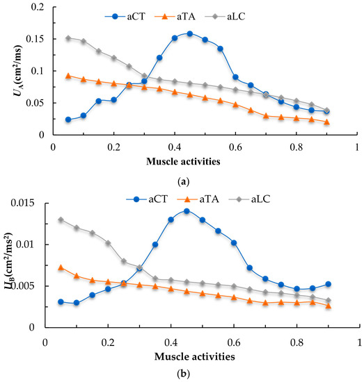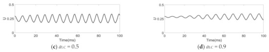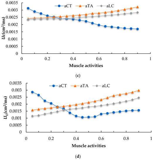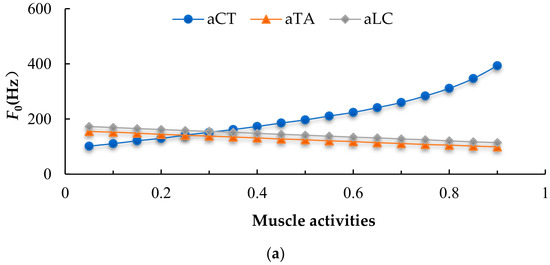 Likewise, we plotted the time rate of glottal flow-rate change, UB, in Figure 6b, which is related to the sound strength of human []. This plot shows several important factors that have direct impact on the onset and intensity of vocal fold vibration in phonation (UB). Compared with UA, the behavior of UB is similar, which means that the variation in glottal flow velocity with different muscle activation is approximately the same as the variation in acceleration of change of the airflow. UB also provides an understanding of efforts to improve intensity of voice production. Changes in laryngeal muscle activities, such as increased CT muscle activities and decreased TA and LC muscle activities, will result in an increase in the amplitude of vocal fold vibration, thus increasing intensity of the voice. The cricothyroid muscle plays the primary role in controlling F0. However, in the pathological vocal fold, the process of changing cricothyroid muscle activity to make F0 reach the medium-high frequency is accompanied by irregular glottal airflow (large airflow velocity fluctuations and large airflow acceleration fluctuations). This suggests that stable voice production cannot be obtained in the vocal fold with a unilateral polyp. Thus, humans usually increase subglottal pressure to match the muscle activation to reduce laryngeal muscle fatigue and increase sound intensity. When the value of aCT is large enough to create a high frequency, UA and UB decrease significantly. According to Section 3.1, this is because the stiffness of the vocal fold is high at this point, making it almost impossible for the vocal folds to vibrate effectively. Hence, it is difficult for a patient with a polyp to phonate even with small fluctuations in the amplitude of UA and UB. Similarly, for the thyroarytenoid and lateral cricoarytenoid muscles, low activity leads to unstable sound intensity. The values of UA and UB decrease monotonically with aTA and aLC.