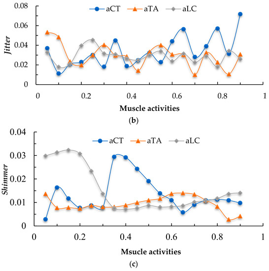 where Ti is the extracted period length, and N is the number of periods []. The mean value of jitter during phonation is depicted in Figure 7b. Overall, there was not a strong correlation with activity of any muscle. For large values of aCT, the jitter was high, reflective of aperiodic vibration. For small values of aTA, a decrease in aTA will generally cause an increase in jitter.
