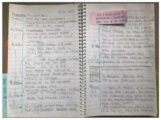 A one-week field research study on user observations was conducted to gain a deeper understanding of the current issues of the public transportation in Kuala Lumpur, Malaysia. The first author spent twenty-eight hours in total during the study. To understand the travelling pain points beyond the KL city centre, the observation took place starting from Putrajaya to Gombak through KL City Centre. The “fly on the wall” technique was used as a method of collecting valid user data in an unobtrusive and cost effecting way []. The first author observed and participated in waiting and riding four different bus companies during this study. This user observation was documented between 7 AM to 10 AM and 6 PM to 9 PM. Reflection notes and photos were taken as a means of data collection during the observation. The collected data was then categorised into issues of system and physical design issues. In the field of behavioural studies, both problem-focused and solution-focused approaches can be explored in relation to goal-oriented activities []. Problem-focused approaches were taken during this study to identify the current issues. These were then used to help construct the online questionnaire to provide a greater understanding of user needs. The main factors that were recorded in the field notes (Figure 1) and photos were the waiting time and how users enter and exit the current bus network, as well as focusing on touch points along the journey such as paying and collecting fares, user comfort levels (both at bus shelter and on bus) and general wayfinding.