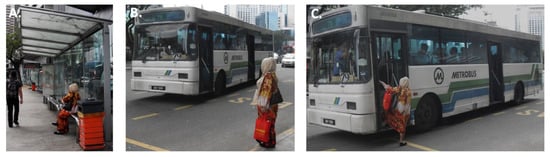 When designing for an urban environment, the inclusion of pedestrian needs should be embedded to promote safer journey experiences []. User observation during field research revealed closely related issues which indicated a need for broader systematic solutions rather than partial solutions. Observational research as such is not the only factor to determine the design rationale; however, it helped gain a deeper understanding of the users’ behaviour and emphasised a need of developing a system with a strong focus on HCD. The observational analysis also found inadequate pedestrian and road conditions in Kuala Lumpur, as well as a lack of priority given to the bus network.