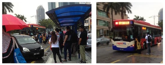 As identified during the user observation, bus lanes are not used by buses causing traffic congestion and an unsafe environment for pedestrians. Bus priority has been trialled in Kuala Lumpur, but it has not been strongly pursued, hence promoting unsafe drivers’ behaviours []. To avoid such situations reinforcing dedicated bus lanes should be provided [], which would have minimal impact on the existing infrastructure. This is evidenced positively in Seoul, South Korea, where the bus service was improved by upgrading over 70 km of dedicated median-bus lanes resulting in nearly doubling the bus operating speed []. The geographic context and population density of Seoul is similar to Kuala Lumpur, which shows that with appropriate planning, government intervention and improved designs, similar improvements are possible.