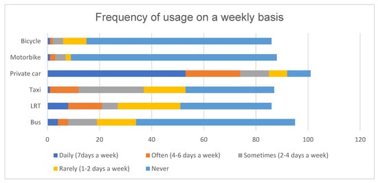 A study by [] on the modelling of transport behaviour in Kuala Lumpur supports the results from the questionnaire by suggesting the need for an improved and efficient public transport system to attract vehicle owners and entice users away from personal vehicles []. This was supported in the questionnaire analysis when participants were asked their preferred mode of transport and the reason why. In this study, ‘efficient’ refers not just to punctuality but to the whole system experience, making it worthwhile for the commuters using public transportation systems. Major factors such as travel time and travel cost, distance from home to public transport and distance from home to work are the contributing factors that influence the modal shift from vehicle to public transport in Malaysia []. In a similar study by Memon et al. [], participants also considered the environmental factor as the motivation for using public transport instead of personal vehicles.