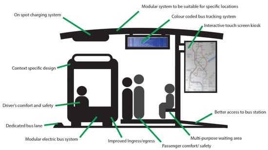 - Modular design. The EV bus stop is designed with modularity in mind to ensure efficient manufacturing and flexibility in construction specific to the context it will be installed in. The HCD principles suggest shorter walk times to access bus stops, meaning there will be more bus stops throughout the network. It is important to make these bus stops suitable to the context while considering cost of implementation. This supports earlier work from Calthorpe [] claiming that 0.8 km is the desired walking distance between train stations and 0.4 km between bus stops. This is also emphasised by Jarrett [], who claims that there are significant regional variations in the unglamorous but crucial struggle over the spacing between succeeding stops or stations on a transportation line.
