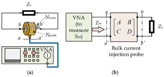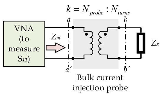 In this section, an enhanced single-probe setup to measure the unknown impedance (Zx), as shown in Figure 1a, is presented. In the proposed setup, the bulk current injection (BCI) probe is connected to one port of the vector network analyzer (VNA) through a coaxial cable. A short wire connecting the unknown impedance is wound on the core of the BCI probe forming multiple turns. In each of these turns, the wire enters the probe inner window from a side, crosses the probe leaving the opposite side, and runs back to the entering side. The turn number of this looped wire is called Nturns. Inside the BCI probe, there is a feeding winding whose number of turns is Nprobe (this number is out of the operator’s control since it is related to the probe manufacturer and model). It is worth noting that it is possible to use not only BCI probes but also current monitor probes, as they are basically the same instrument, and many models are declared for both purposes by manufacturers. However, their design is usually optimized for one of the two scopes. Monitor probes have a high number of turns Nprobe in order to reduce the loading impedance ( Ω) on the clamped cable, which would perturb the circuit under test. Conversely, BCI probes usually have a very low Nprobe to be effective in inducing a longitudinal voltage source onto the clamped cable.