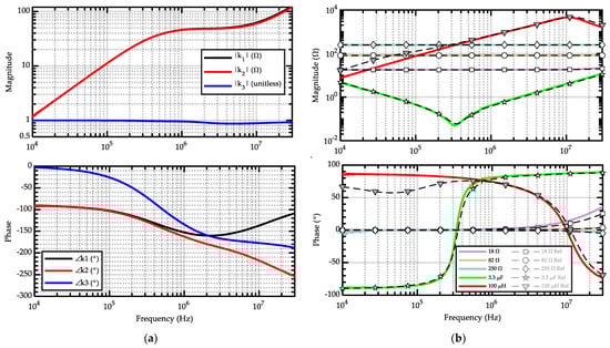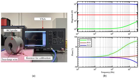 The amplitude and phase of k1, k2, and k3 obtained from the calibration procedure are plotted in Figure 4a, and are consistent with the ideal theoretical expectations (10) in the in-band region (1–5 MHz). Specifically, since the turn ratio k is equal to 1 in our setup, the coefficients become k1 = k2 = −Z0 = −50 Ω and k3 = −1. Outside that narrow in-band region, the coefficients exhibit a non-trivial frequency response, which is determined by all the possible complex phenomena (e.g., lossy and dispersive ferrite core, inductive and capacitive parasitic effects) associated with the specific BCI probe model.