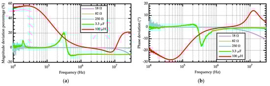 Lastly, as far as the inductor measure is concerned, the same considerations drawn for resistors measures apply both in the tens of kHz and MHz ranges. Additionally, as mentioned, in the 10–100 kHz range a significant error due to capacitive effects is present. However, considering the percentage errors reported in Figure 5a, in the frequency range from 110 kHz up to 30 MHz, the inductor impedance measure is not less accurate than the other component ones.
