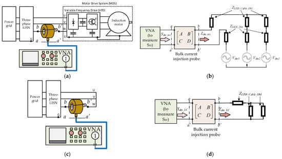 Two setup configurations are employed to determine these two impedances. In the first configuration, the probe is clamped on any phase of the motor drive system with (see the example for phase W in Figure 7a). Meanwhile, the ground cable between the motor drive system and the LISN is disconnected. No matter which phase is measured, the equivalent circuit of this setup can be represented as in Figure 7b. The measured reflection coefficient (Sdm_tot) can be used to calculate the impedance (Zdm_tot) seen at b-b’ by (14). In the second configuration in Figure 7c,d, the motor drive system is taken out, and the cable terminals of phases U, V, and W on the motor drive system side are connected to assess the external circuit (Zdm_LC), which is derived from the measured Sdm_LC by (15). Eventually, the two impedances of the DM equivalent circuit (ZLISN_Cable_DM and ZMDS_DM) can be computed from (16) and (17) by circuit theory. Due to the symmetry assumption, the minor differences between measurements on each phase are assumed to be non-intentional deviations. Consequently, the results in the next section are based on the average values calculated from three measurements on each phase.