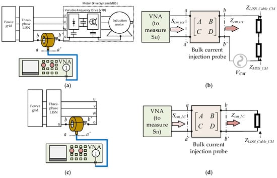 Setups to determine CM equivalent circuit: (a,b) in the presence and (c,d) in the absence of the motor drive system.