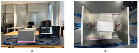 (a) Setup for S-parameter measurement of a three-phase filter and (b) filter arrangement inside a metallic enclosure equipped with SMA connectors.