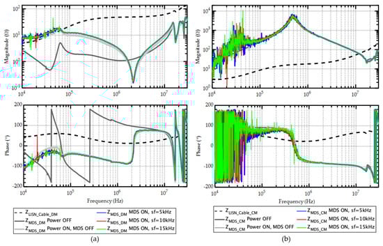 The impedance ZMDS_DM of the motor drive system shows a significantly different behavior depending on the power being turned OFF and ON (see the black curve and other curves in Figure 10a). Thus, the online DM impedance cannot be represented by the one measured offline in this motor drive system setup. This conclusion is in line with other research works []. Except for a small portion below 70 kHz, where the switching frequency and its harmonics affect measurement accuracy, the impedance ZMDS_DM does not exhibit significant variations if the switching frequency is changed (sf = 5 kHz, 10 kHz, and 15 kHz). When power is ON, and the motor drive system is OFF (grey curve), it displays almost the same impedance as the other three operating conditions but with less noise at low frequency. This result suggests measuring the online DM impedance by simply turning ON the power while leaving the motor drive system OFF.