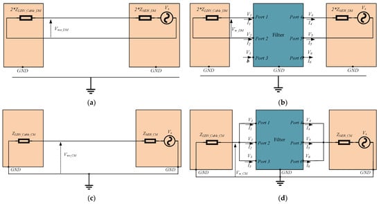 Setups for computing the in-circuit IL. Left and right panels show the (a,b) DM and (c,d) CM setups without and with the filter, respectively.