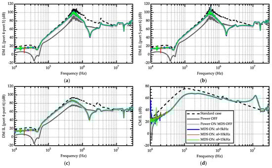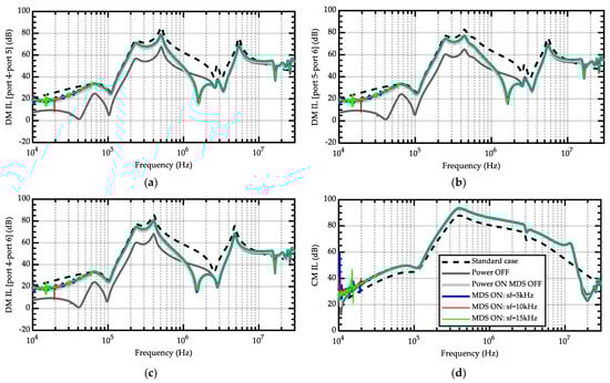 For the DM, it can be observed that the offline DM IL (black curve) significantly underestimates the actual (i.e., when the motor drive system is working) effectiveness of the filter in the frequency band below 10 MHz. Hence, the online DM impedance shall be used in order to achieve reliable estimates of the in-circuit DM IL. Conversely, the specific operation condition (power ON, motor drive system OFF, and different switching frequencies) does not significantly affect the DM IL. The IL measured according to the standards significantly overestimates the actual DM IL from 500 kHz to 10 MHz.