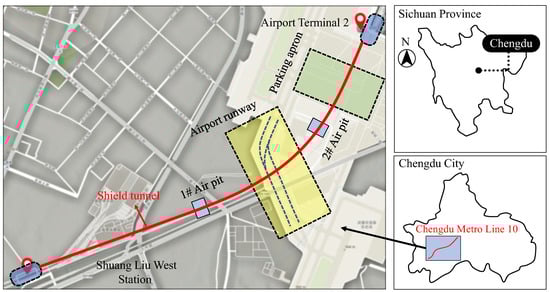 This study is based on the Chengdu subway project in China. The tunnel from Shuang-Liu West Station to Shuang-Liu Airport Terminal 2 of Chengdu Metro Line 10 is located in the Shuang-Liu District (Figure 1), which highlights the Chengdu Metro Line 10 Phase II Project undercrossing the Chengdu Shuang-Liu Airport flight area. The undercrossing area is mainly runways and sward, and the subway terminal station is Shuang-Liu Airport Terminal 2. The lithological log around the shield tunnels mostly consists of miscellaneous fill, silty clay, sandy cobble and weathered mudstone with increasing depth (Figure 2).