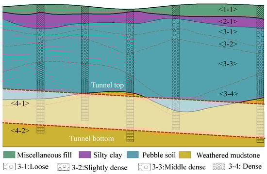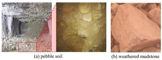 The pebble soil and weathered mudstone strata are widely distributed in the Chengdu area; the special engineering characteristics of these strata have caused great difficulties for shield construction, as shown in Figure 4. The characteristics of these two strata are introduced in this section. The pebble stratum is brown grey or grey yellow, mainly loose or medium dense. The pebbles are mainly slightly weathered magmatic rocks and metamorphic rocks. The shape of pebbles is subcircular. The pebble content in this stratum is generally 60~70%, the particle size is mainly 2~15 cm and the maximum particle size is approximately 40 cm. The filling materials are mainly fine and medium sand and round gravel. A pebble stratum is a typical mechanically unstable formation with a large gap between particles and almost no cohesion. Under anhydrous conditions, force is transmitted through point contact between particles and the stratum reaction is sensitive. During the construction of shield tunnels, the stable state of the stratum is easily destroyed and collapses, resulting in large stratum loss and disturbance to the surrounding rock.